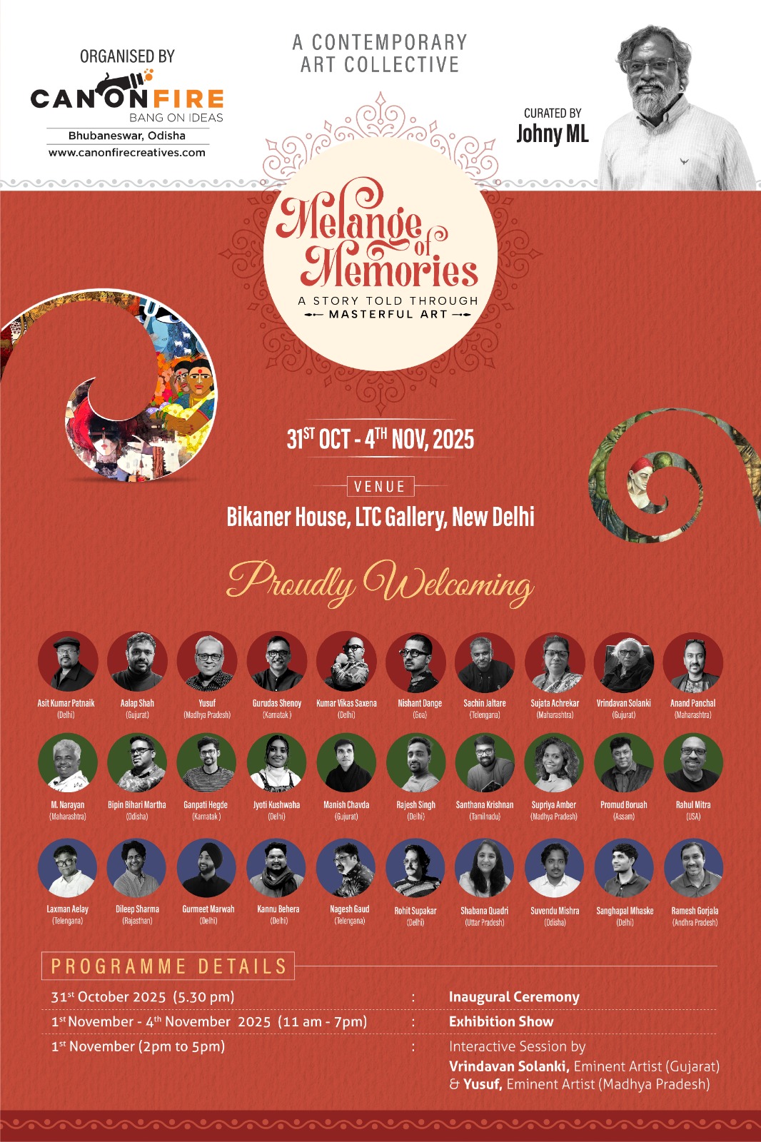 Canonfire presents Melange of Memories an evocative art exhibition curated by Johnny ML celebrating the intersections of time, emotion and imagination Experience a vibrant collection of contemporary expressions at LTC Building Bikaner House from 31st October to 4th November 2025 ti11 AM to 7 PM Immerse yourself in a journey through art reflection and memory