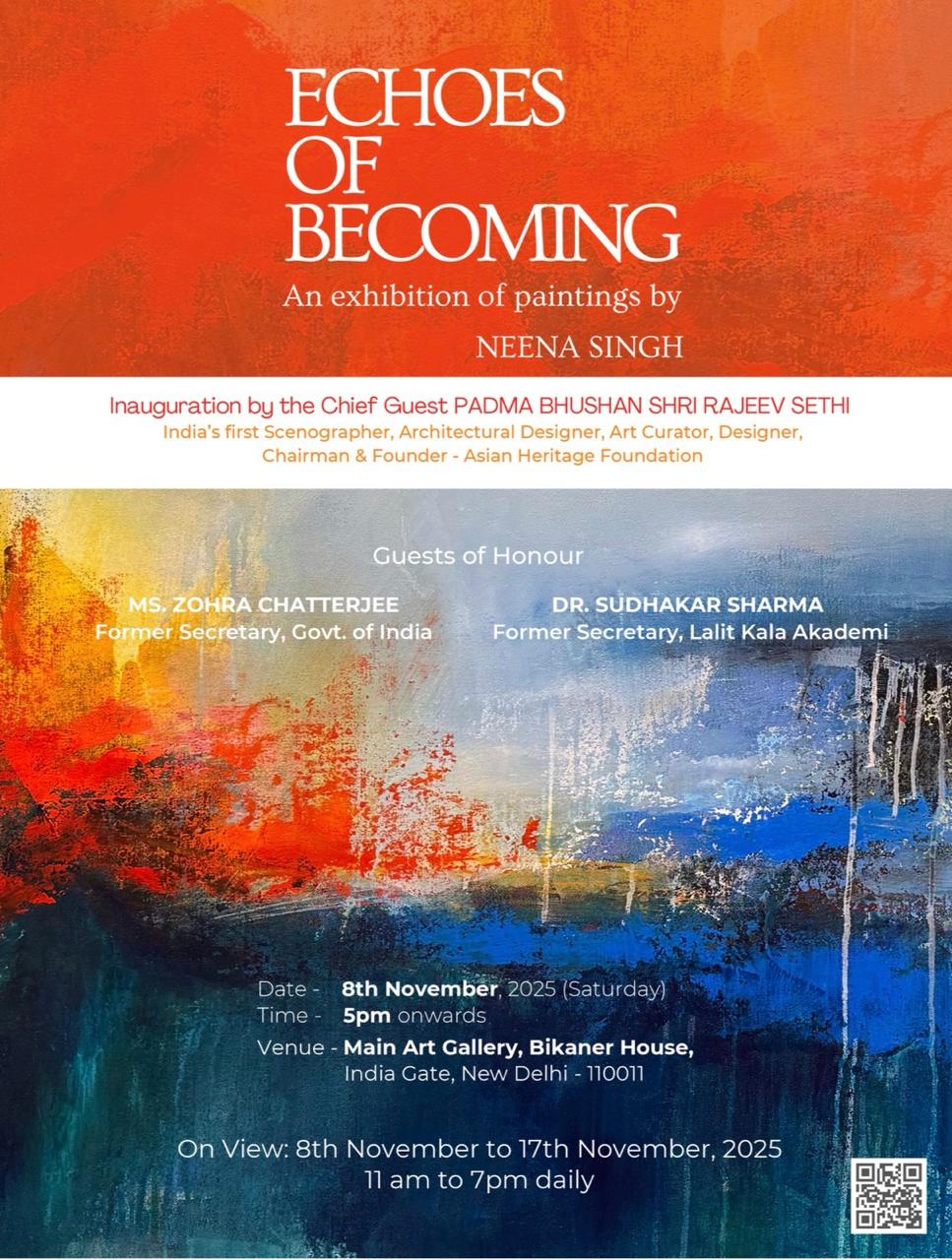 “Echoes of Becoming” a solo exhibition of paintings by Neena Singh invites you into layered colour, silence memory and emergence The show unfolds 8–17 November 2025 11am to 7pm at the Main Art Gallery Bikaner. ComEchoes of Becominge experience paintings that sense the unseen and speak before language.