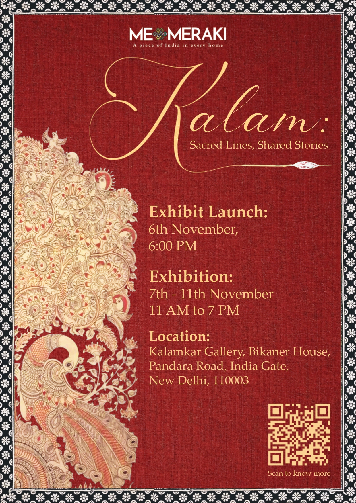 After the resounding success of Kalam in Hyderabad MeMeraki brings this extraordinary exhibition to Bikaner House, Delhi 6th to 11th November showcasing FOUR rare Kalamkari traditions under one roof for the very first time 7 to 11 November 11 AM 7 PM Come discover sacred lines, shared stories and a celebration of Kalamkari like never before.