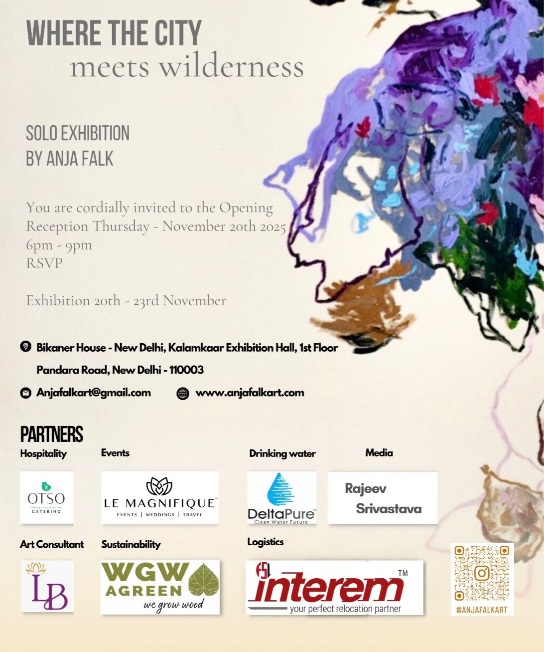 Step into a world where the City Meets Wilderness a Solo Exhibition by artist Anja Falk Showcasing Contemporary painting and sculpture inspired by Delhi's forests and the balance between urban life and nature. At Bikaner House New Delhi Exhibition Schedule from 21st to 23rd November 2025 11am to 7pm daily