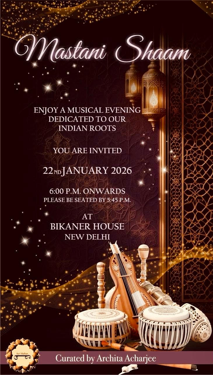 Mastani Shaam by Indian Roots unfolds on 22nd January 2026 at Chandni Bagh Bikaner House New Delhi from 6pm onwards Curated by Archita Acharjee the evening promises a rich cultural experience celebrating tradition music and timeless elegance in an enchanting setting