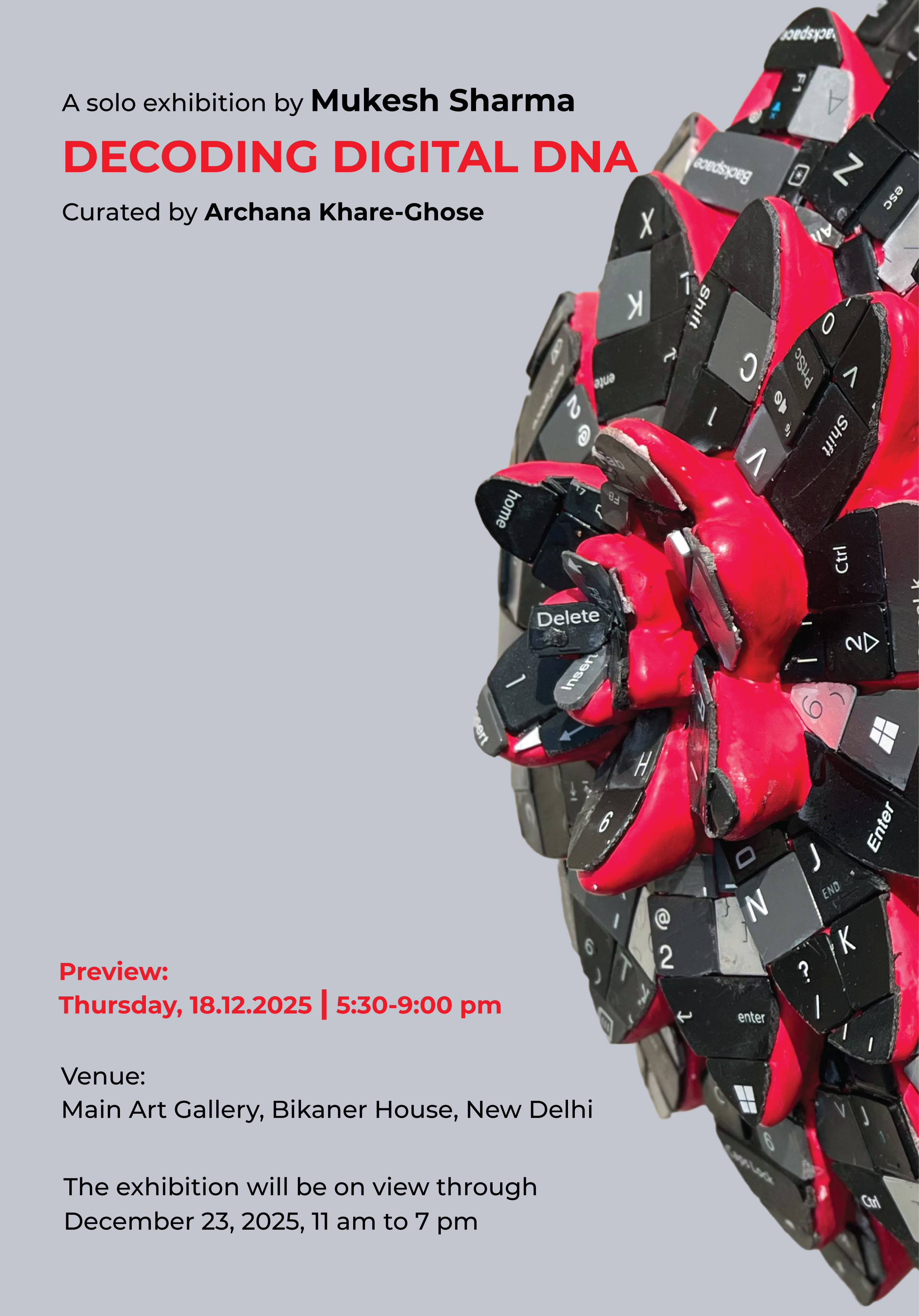 Mukesh Sharma latest finished large-scale sculptural and multimedia installations as well as paintings will be on view in Decoding Digital DNA at Bikaner House from December 18–23 2025 For nearly two decades, I have been sifting through the detritus of the digital world, exploring how this new layer of human existence reshapes the ways we live behave, and remember nology is changing our lives. Exhibition Details Title Decoding Digital DNA Curated by Archana Khare-Ghose Preview December 18, 2025, 5:30–9:00 PM Venue Main Art Gallery, Bikaner House On View December 18–23, 2025 11 AM to 7PM