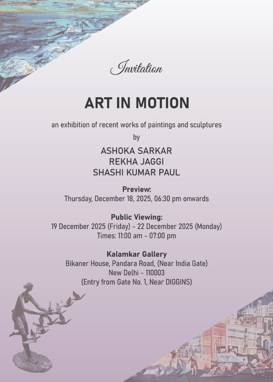 Art in Motion presents an engaging exhibition of recent paintings and sculptures by Ashoka Sarkar, Rekha Jaggi, and Shashi Kumar Paul The showcase explores movement form, and expression through diverse artistic practices. Join us for the preview on 18 December at 6:30 pm onwards The exhibition is open for public viewing from 19th to 22nd December 2025 at Kalamkaar Gallery Bikaner House offering an immersive encounter with contemporary visual narratives
