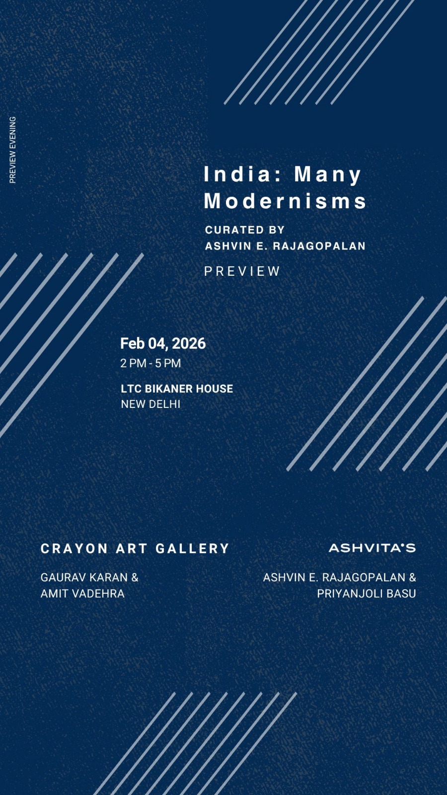 Crayon Art Gallery and Ashvita’s warmly invite you to The Preview for India Many Modernisms curated by Ashvin E Rajagopalan 4th February 2026 Wednesday 2 PM to 5 PM exhibition on view till 10th February 2026 11am to 7pm at LTC building Bikaner House New Delhi Join us to witness an exceptional selection of iconic works by India’s modern masters brought together in a carefully curated presentation